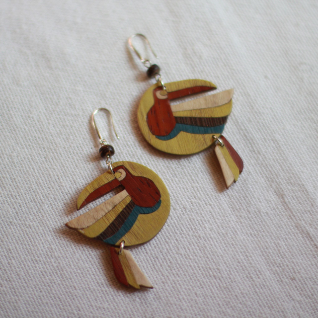 Boucles d'oreilles en marqueterie de bois : assemblage de placages de différentes essences de bois naturelles ou teintées.